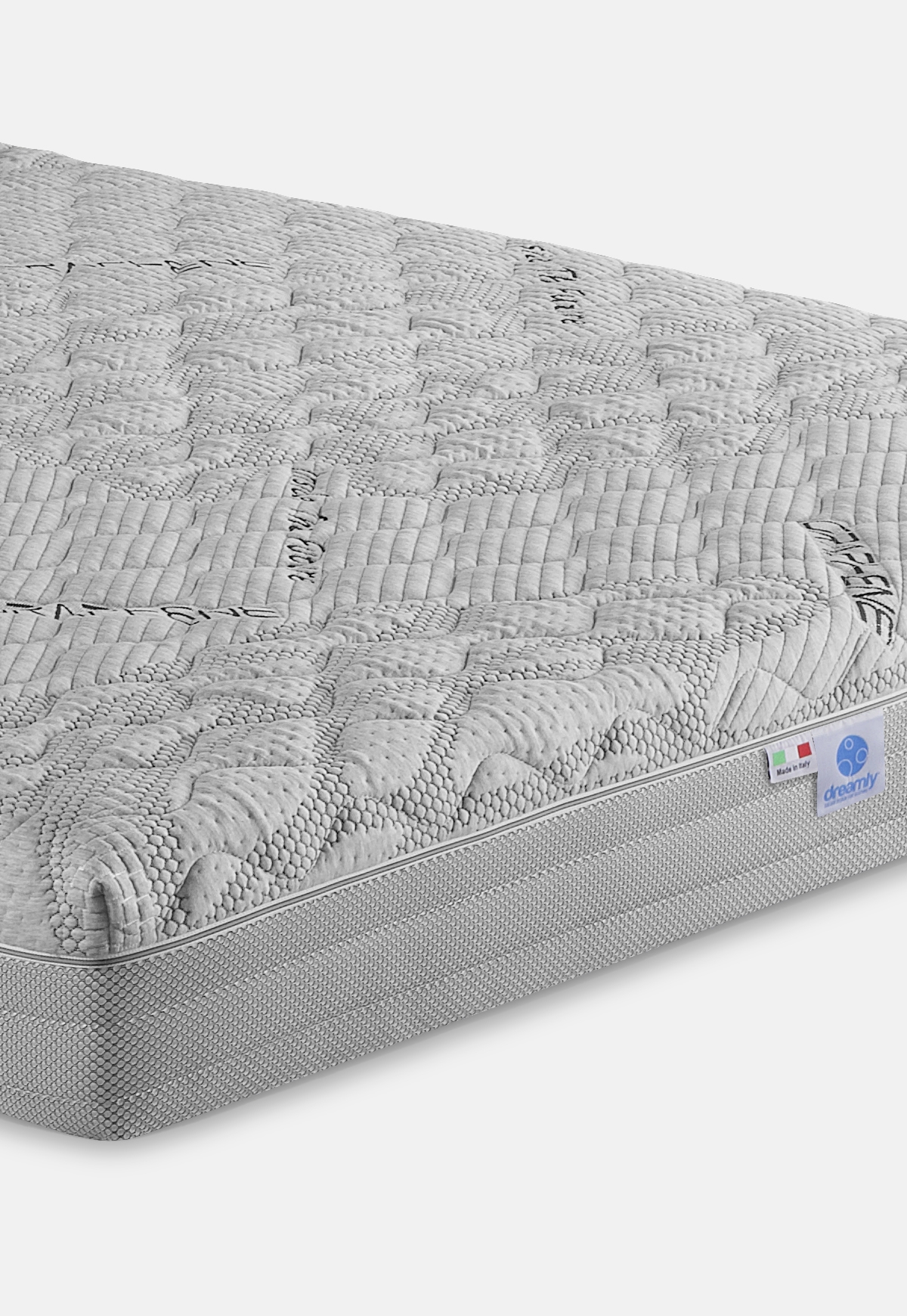 Pocket spring mattress comprising 7-zone memory foam layer with massage function, high bearing capacity Aquafoam pocket spring sheet with 800 pocketed springs. This allows a progressive and self-modelling reaction.