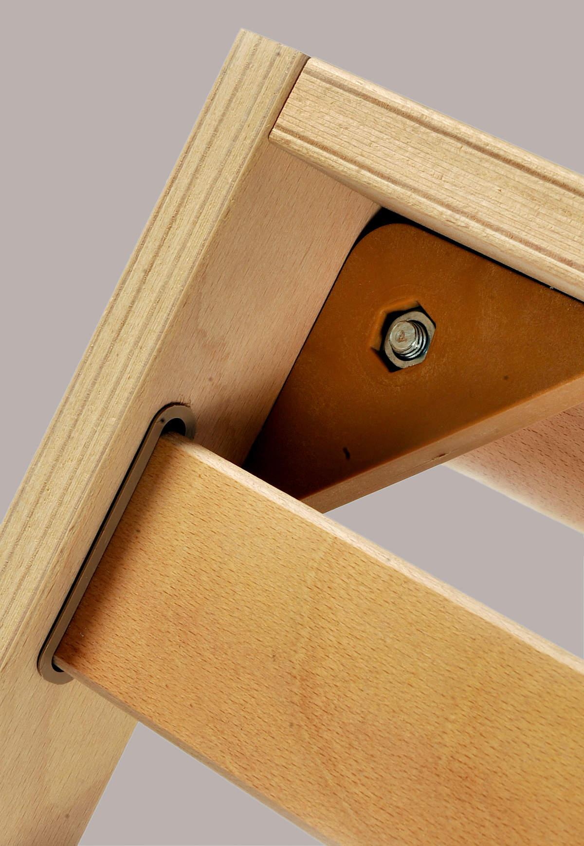 Slats insert into the frame through plastic sleeves to prevent noise. Firmness adjustment: In the lumbar region the bed frame is made with a special system of triple slats and slider that work to regulate the hardness. There is also a frame reinforcement. Angular plate in nylon-fiber glass: the feet are fixed to the bed frame using a special angular plate in nylon fiber glass that works also as stabilizer support