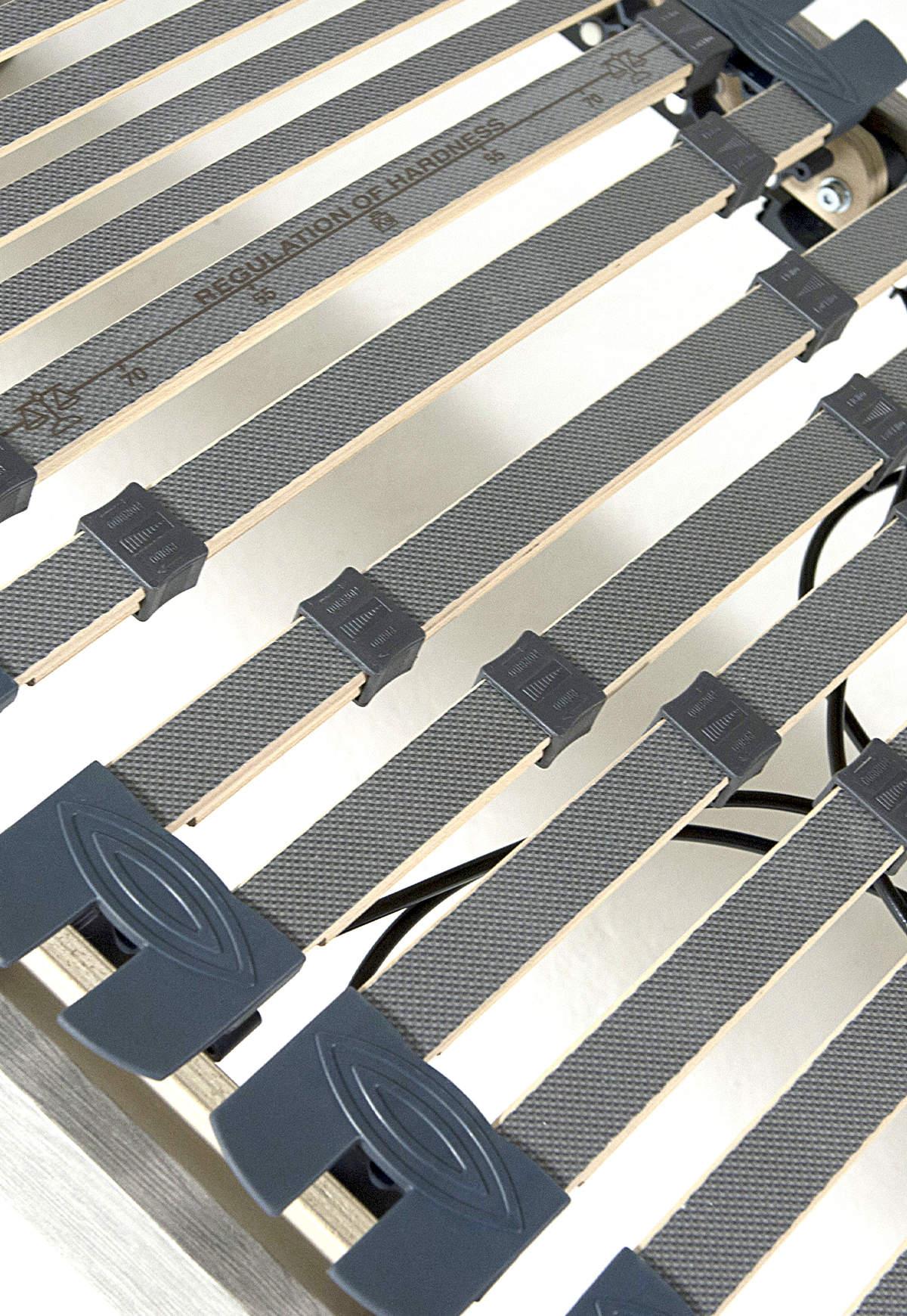 Firmness adjustment: In the lumbar region the bed frame is made with a special system of double slats and slider that work to regulate the hardness. Elongated slats support: The tilting flexor joints, helps all the slats to ensure a ideal springing, interacting actively to solicitations of the mattress.