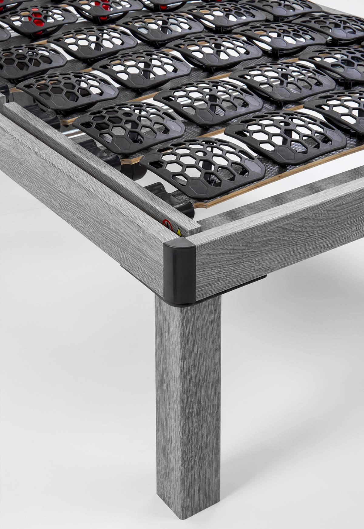 The area is equipped with TSS, and indipendent adjustable suspension system. Firmness adjustment: in the lumbar region the bed frame is equiped with a TSS that allow you to customize the riogidity and to follow the need of the body. Rounded angle: a special rounded angle made in solid wood is reinforced witha a angular pplate in nylon-fiber-glass.
