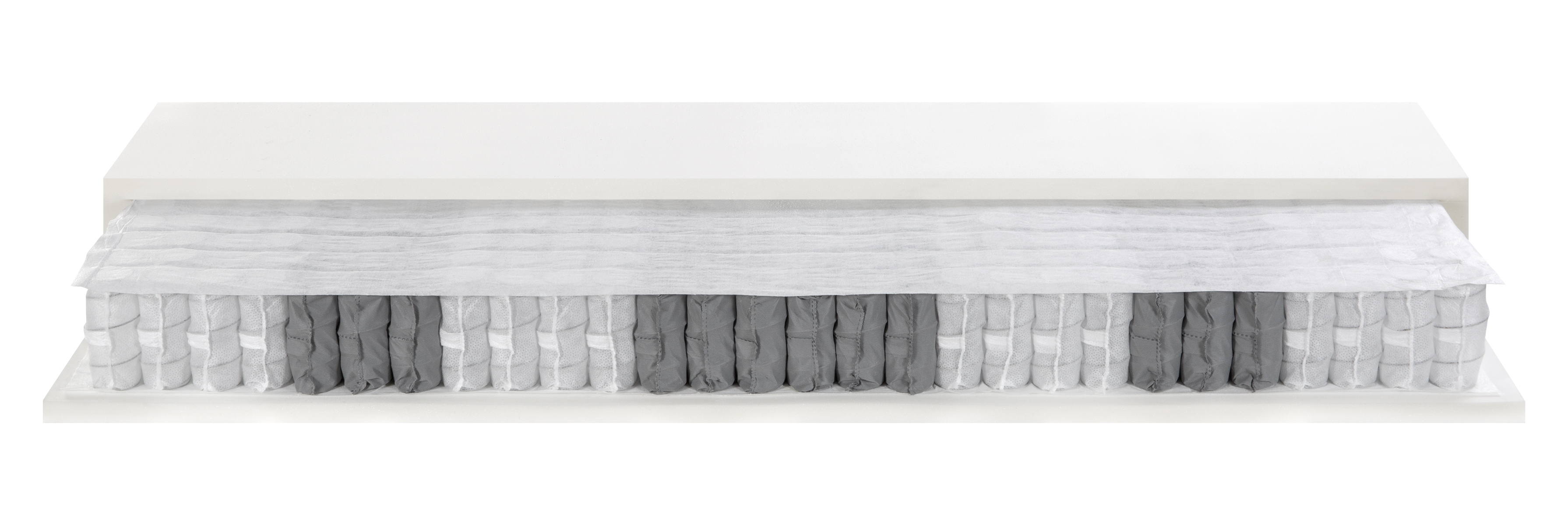 Pocket spring mattress consisting of a high bearing capacity Aquafoam layer, technical insulation fabric and a high bearing capacity Aquafoam box spring sheet with 800 pocketed springs. This allows a progressive and self-modelling reaction.