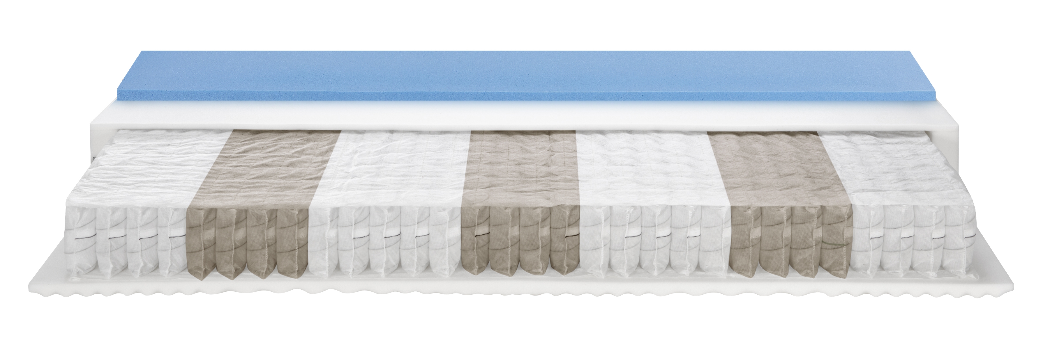 Pocket spring mattress comprising 7-zone memory foam layer with massage function, high bearing capacity Aquafoam pocket spring sheet with 800 pocketed springs. This allows a progressive and self-modelling reaction.
