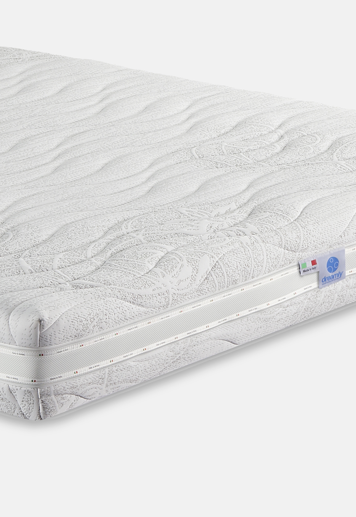 Schiuma aquafoam a celle aperte prodotta con l’utilizzo di acqua e aria, anallergica, indeformabile ed ad alta traspirabilità con strato memory bugnato in superficie per creare un effetto accogliente e massaggiante.