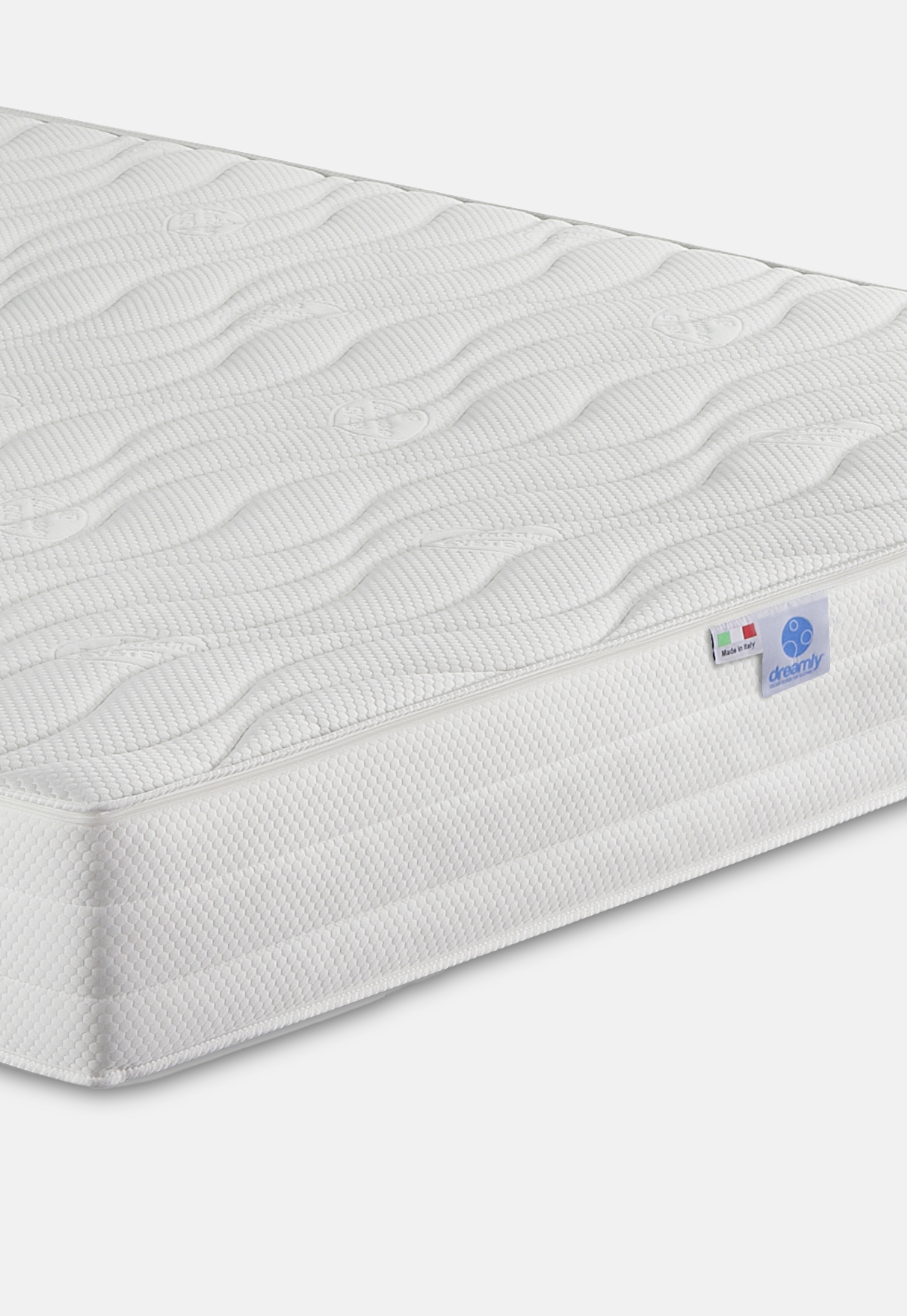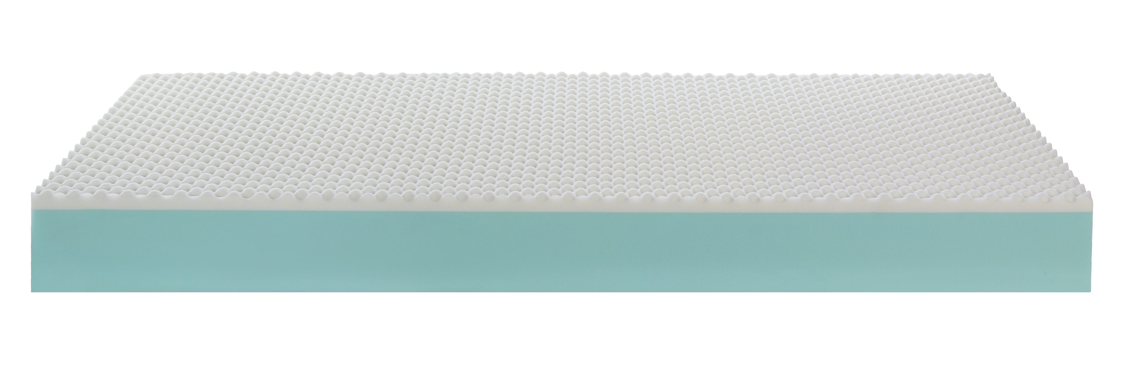 Schiuma aquafoam a celle aperte prodotta con l’utilizzo di acqua e aria, anallergica, indeformabile ed ad alta traspirabilità con strato memory bugnato in superficie per creare un effetto accogliente e massaggiante.